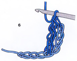 Столбик с двумя накидами выполнен (6). Это вторая петля ряда. Первая петля образована четырьмя пропущенными воздушными петлями.